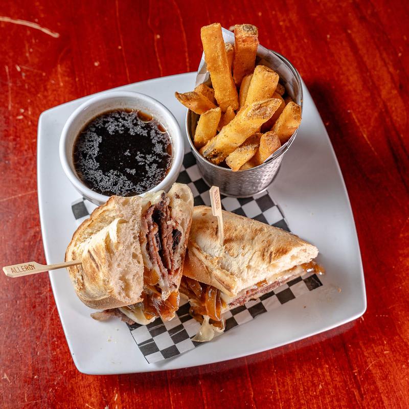 Hand sliced smoked brisket served on a Banh Mi Bun with grilled onions and Tillamook Swiss and Provolone cheese, served with au jus.